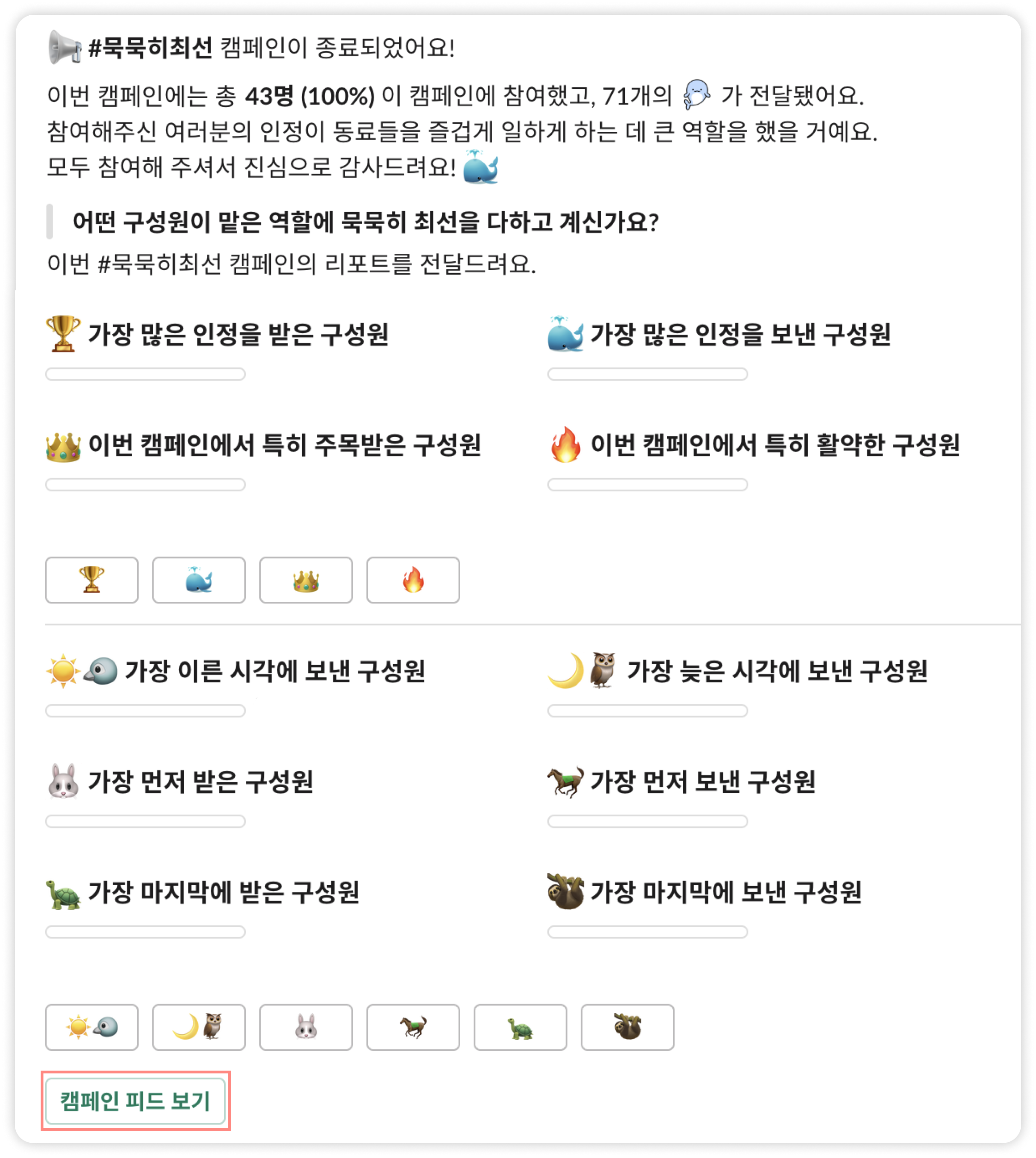 `캠페인 피드 보기` 버튼으로 이번 캠페인으로 전달된 인정을 모아 볼 수 있어요.
