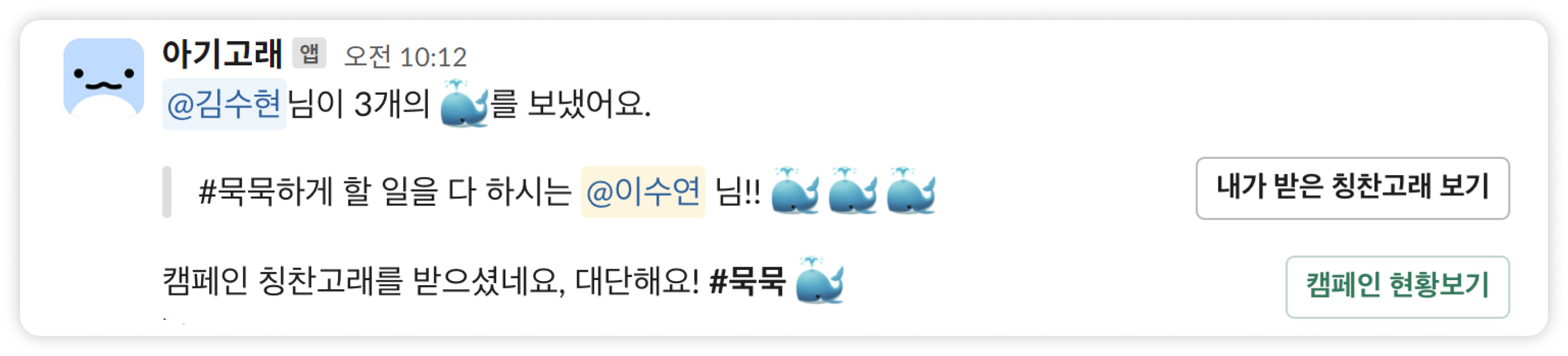 <figure><img src="https://1202451465-files.gitbook.io/~/files/v0/b/gitbook-x-prod.appspot.com/o/spaces%2FHVldaEbwt0TzrMr7QuhJ%2Fuploads%2FGqegFqEMDKl77URS3M0C%2Fimage.png?alt=media&#x26;token=409ff214-ff52-454c-a7e8-6bd6039f56e8" alt="" width="563"><figcaption><p>아기고래가 전달한 캠페인 인정 메시지</p></figcaption></figure>