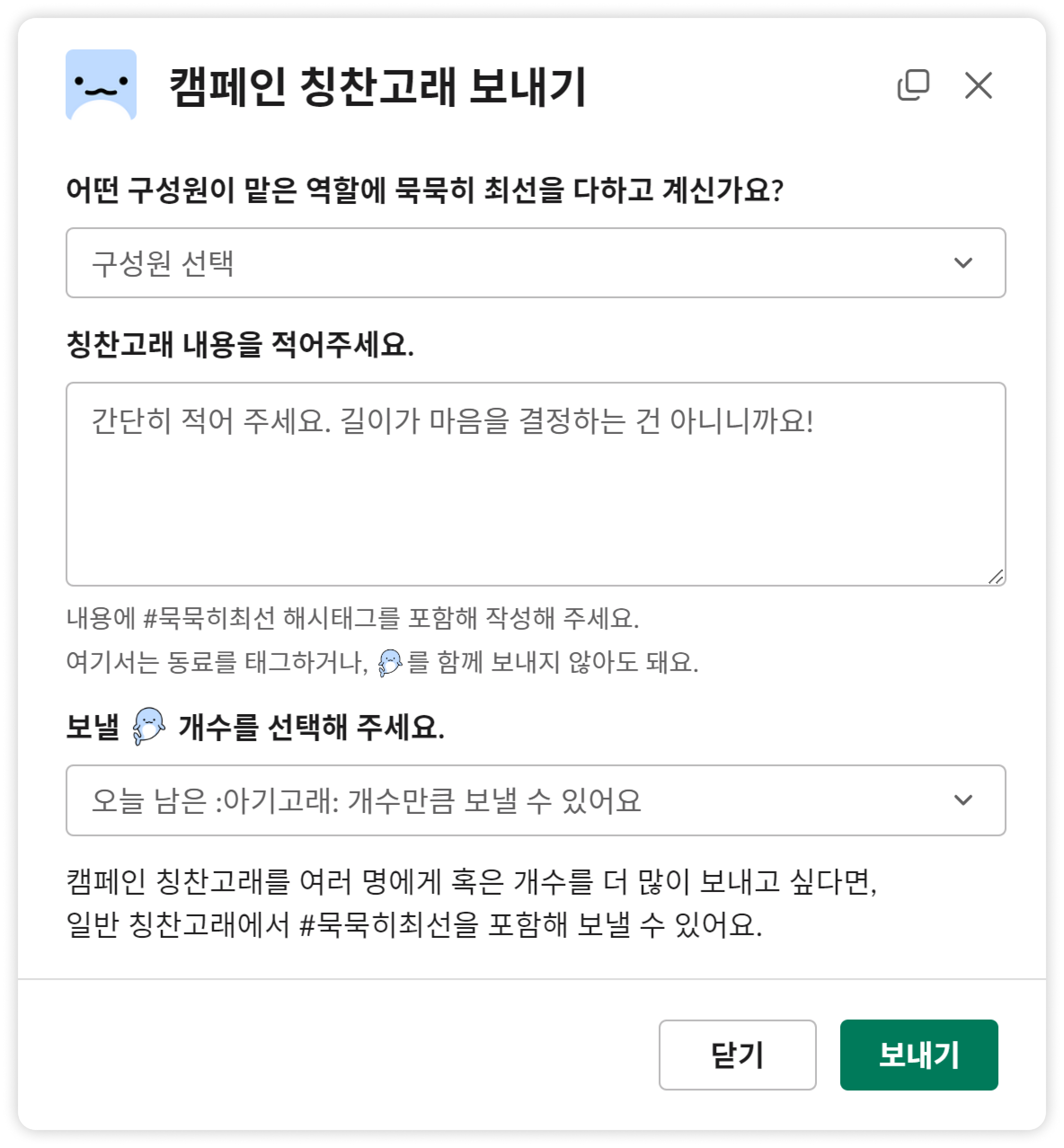 캠페인 인정 보내기 창을 통해 보낼 경우, **내용** 칸에 따로 동료를 태그하거나 인정 이모지를 **사용하지 않아도 돼요**. 전달할 메시지와 함께 캠페인 해시태그만 포함해 주세요.