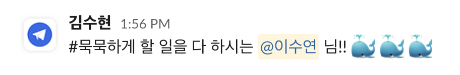 <figure><img src="https://1202451465-files.gitbook.io/~/files/v0/b/gitbook-x-prod.appspot.com/o/spaces%2FHVldaEbwt0TzrMr7QuhJ%2Fuploads%2FWmq2w9a52trsaK7mKdtl%2Fimage.png?alt=media&#x26;token=11ce8500-c3e9-47e3-a0f6-a3e5e0784500" alt="" width="563"><figcaption><p>#묵묵 해시태그를 포함한 인정 전달 예시</p></figcaption></figure>