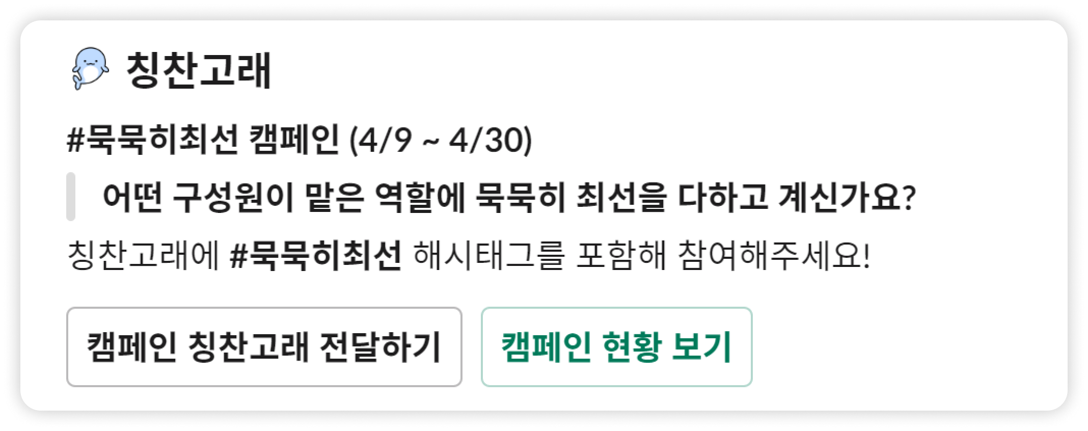 캠페인 기간 동안 [인정](https://docs.babywhale.io/features/recognition/whale)과 [익명 인정](https://docs.babywhale.io/features/recognition/anonwhale) 메시지에 캠페인 해시태그를 포함해 보내면, \